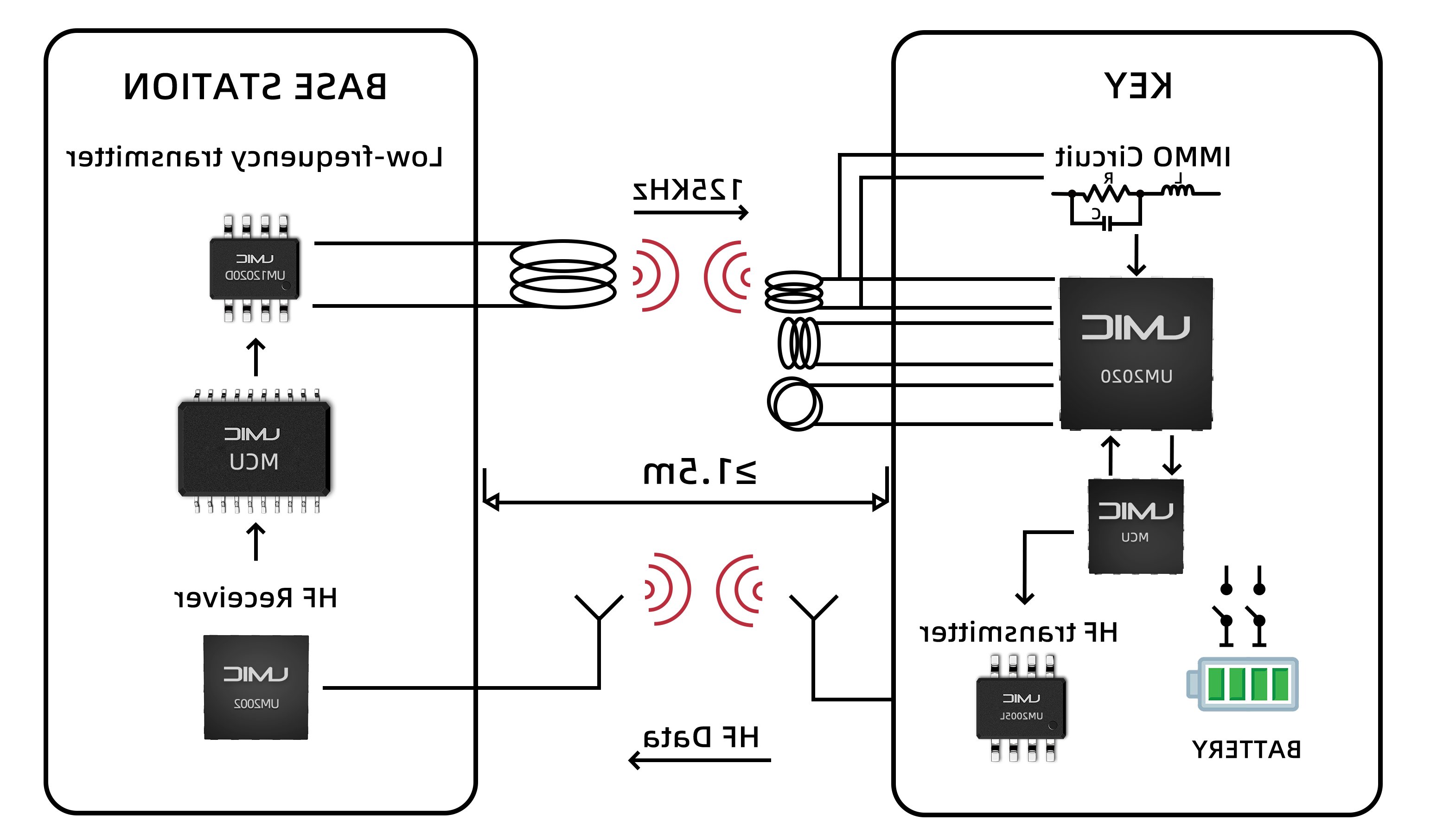 广芯微基于低功耗高性能低频接收SoC芯片UM2082F08、FSK(OOK)发射芯片UM2001(或2.4G发射芯片UM2052)组成的钥匙方案,以及采用广芯微低功耗32位MCU芯片UM3213A、FSK(OOK)接收芯片UM2002(或2.4G接收芯片UM2052)组成基站发射端,构成完整PKE解决方案。